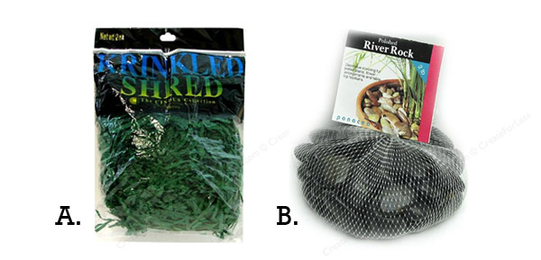 | Once you've got the dowels anchored into the foam, fill the pot with dark green shredded paper to cover up the foam. Optional: add stones on the top for a fancier effect if desired. A. Cindus Krinkle Shred 2 oz Hunter Green from Create for Less B. Panacea Decorative Accents River Rock Black 2lb Bag from Create for Less |